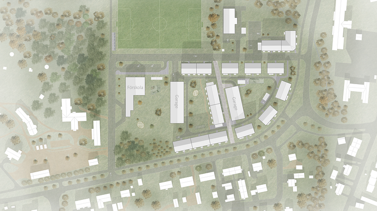 Planen möjliggör för bostäder i fyra våningar och förskola i två våningar. Förskolan är indragen från Sockenvägen för att säkerställa en skolgård i söderläge. Majoriteten av bostäderna är placerade utmed Sockenvägen. Sockenvägens bredd tillsammans med träd, cykelväg och förgårdsmark ger ett naturligt avstånd till befintlig bebyggelse söder om Sockenvägen. Parkeringsytor för idrottsplanen samordnas med skolans. I de norra delarna av planområdet sparas en stor del natur för att hantera dagvatten.