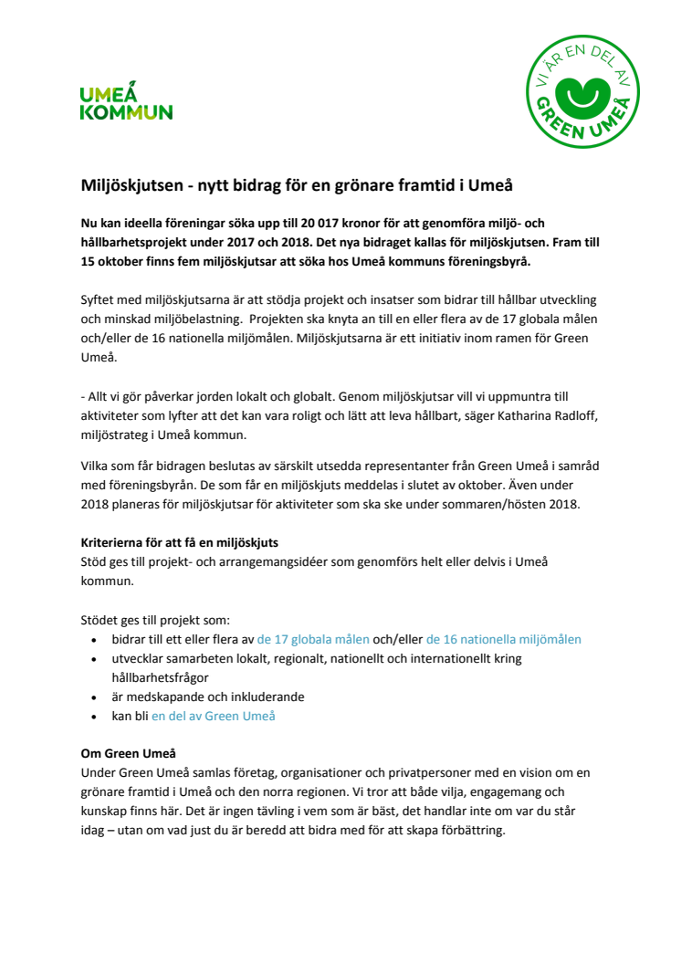 Vilka som får bidragen beslutas av särskilt utsedda representanter från Green Umeå i samråd med föreningsbyrån. De som får en miljöskjuts meddelas i slutet av oktober. Även under 2018 planeras för miljöskjutsar för aktiviteter som ska ske under sommaren/hösten 2018.