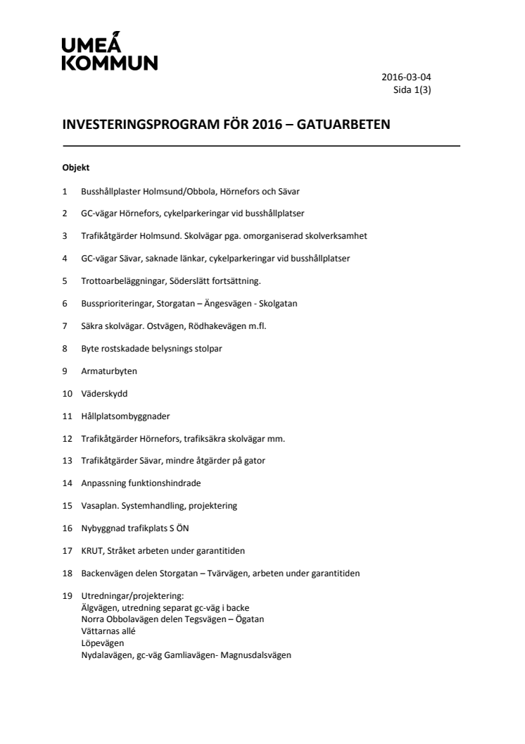 Förutom den nya Lundabron fortsätter kommunen sin satsning på bland annat upprustningen av tjälskadade gång- och cykelvägar. Det blir också en del om- och nybyggnad av gång- och cykelvägar t ex på Mariehem. Gång - och cykelvägen mellan Ålidhem och Universitetet ska breddas.