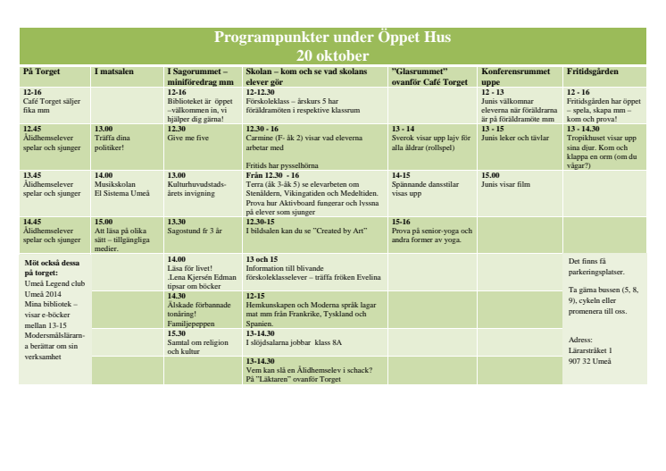 Under Öppet hus, söndag 20 oktober, visar verksamheterna upp sin egen verksamhet och erbjuder tillsammans med samverkanspartners ett stort utbud av olika aktiiteter. Besökarna kan till exempel se eleverna arbeta med olika ämnen, hälsa på ormar från Tropikhuset, lyssna på miniföredrag och träffa politiker. Områdets 5-åringar får också en särskild inbjudan där de får chansen att se hur förskoleklassens verksamhet ser ut.