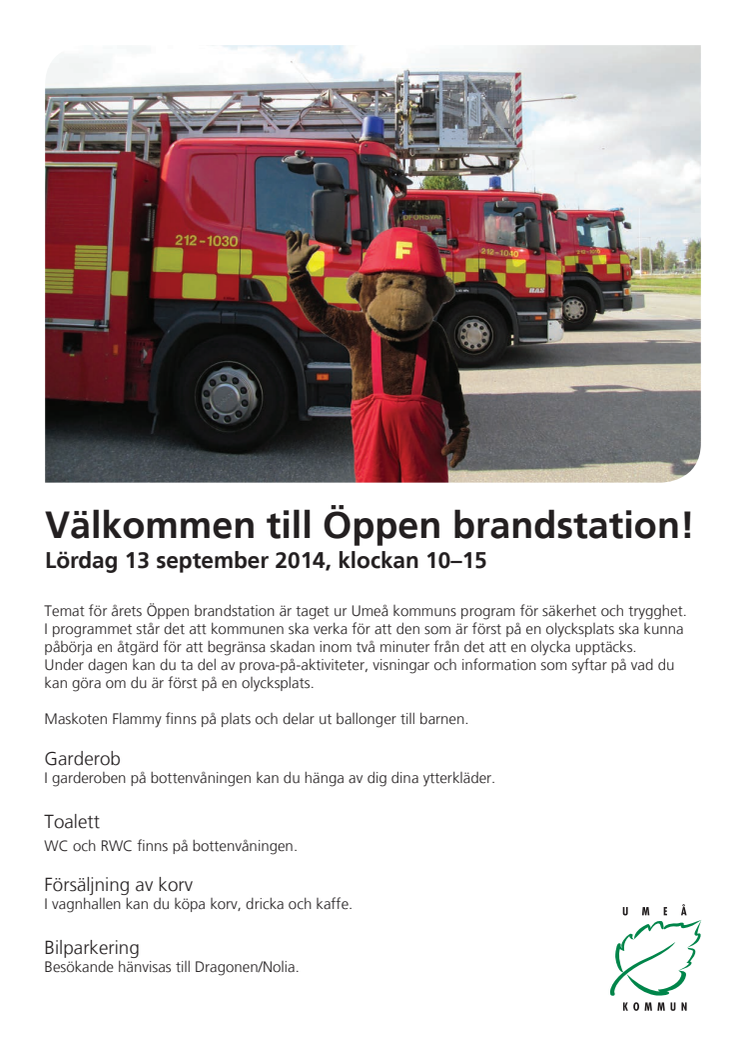 Lördag 13 september är det öppet hus på brandstationen i Umeå. Lär dig om hur du kan begränsa skadorna vid en olycka eller brand. Prova på utrustning, se på uppvisningar och testa hjärt- och lungräddning är några aktiviteter under dagen.