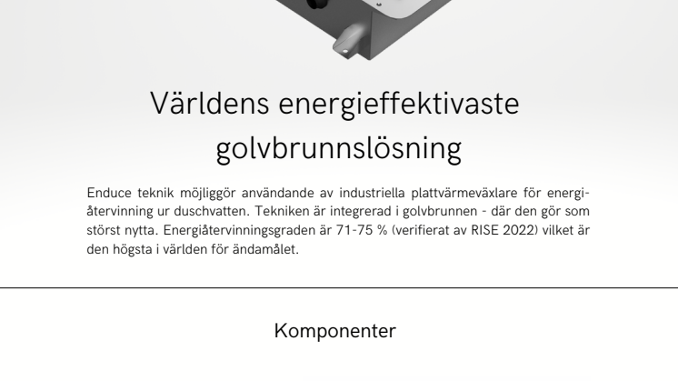 Enduces innovativa golvbrunn, som återvinner värdefull energi som annars rinner ut i avloppet och som testats 6 000 gånger i kommersiell miljö och boendemiljö, har utvecklats i nära samarbete med etablerade aktörer inom VVS och prefab. Under 2023 planeras serietillverkning.