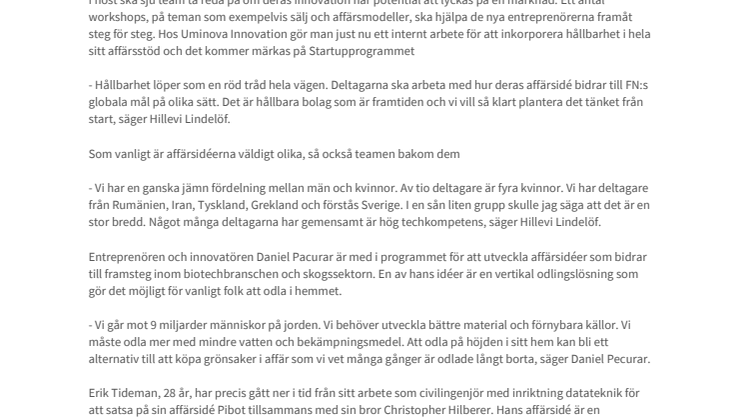 I höst ska sju team ta reda på om deras innovation har potential att lyckas på en marknad. Ett antal workshops, på teman som exempelvis sälj och affärsmodeller, ska hjälpa de nya entreprenörerna framåt steg för steg. Hos Uminova Innovation gör man just nu ett internt arbete för att inkorporera hållbarhet i hela sitt affärsstöd och det kommer märkas på Startupprogrammet
