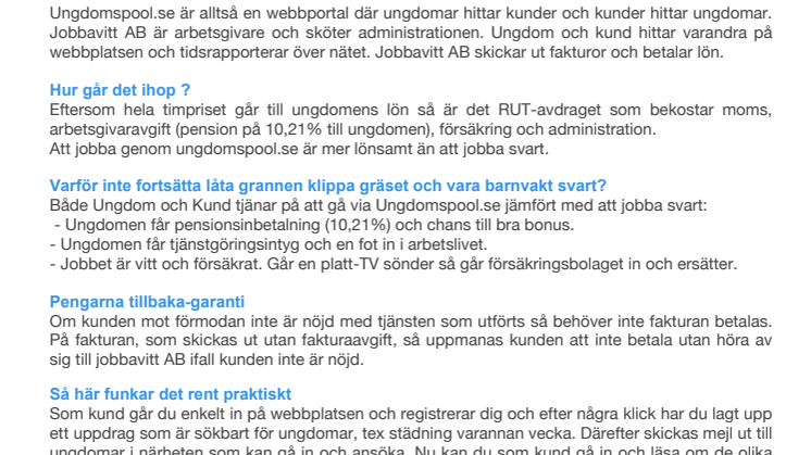 Ungdomspool.se är alltså en webbportal där ungdomar hittar kunder och kunder hittar ungdomar. Jobbavitt AB är arbetsgivare och sköter administrationen. Ungdom och kund hittar varandra på webbplatsen och tidsrapporterar över nätet. Jobbavitt AB skickar ut fakturor och betalar lön.