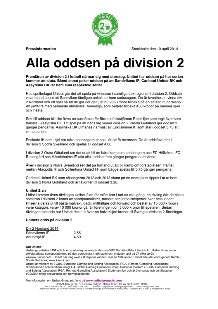 Premiären av division 2 i fotboll närmar sig med storsteg. Unibet har oddsen på hur serien kommer att sluta. Bland annat pekar oddsen på att Sandvikens IF, Carlstad United BK och Assyriska BK tar hem sina respektive serier.