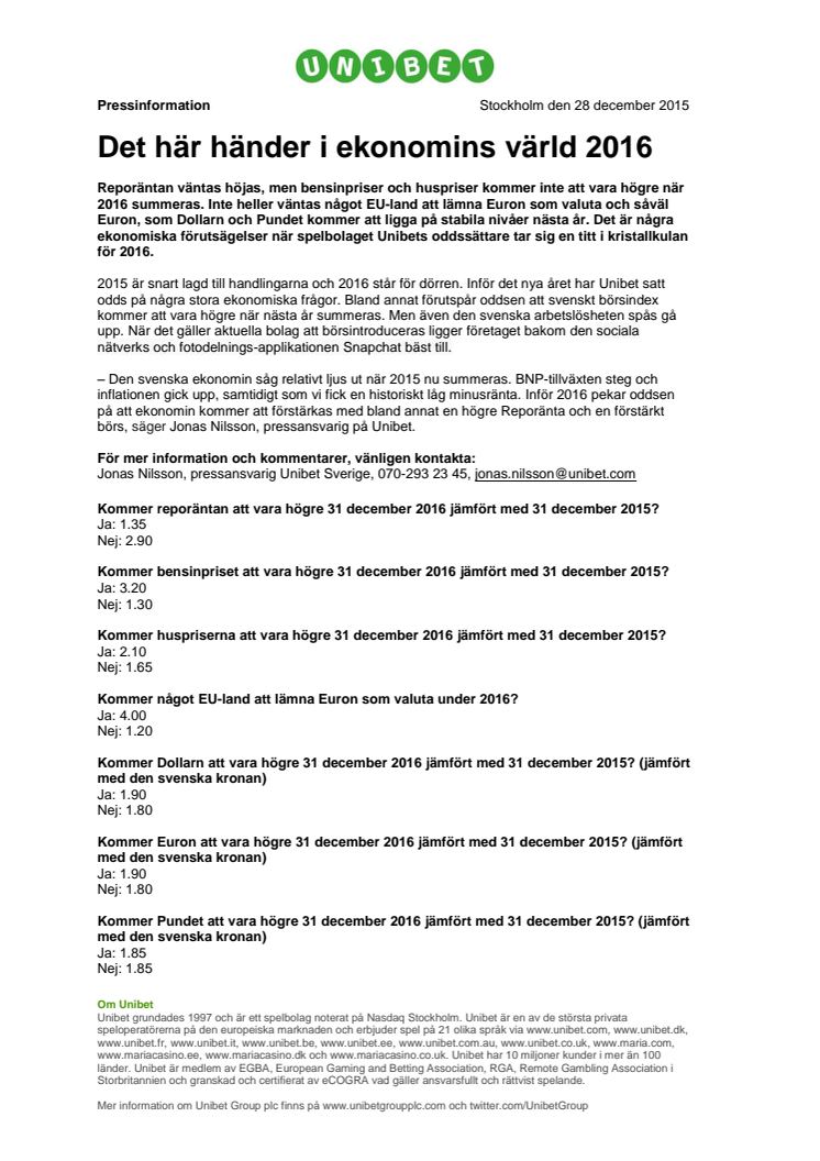 Reporäntan väntas höjas, men bensinpriser och huspriser kommer inte att vara högre när 2016 summeras. Inte heller väntas något EU-land att lämna Euron som valuta och såväl Euron, som Dollarn och Pundet kommer att ligga på stabila nivåer nästa år. Det är några ekonomiska förutsägelser när spelbolaget Unibets oddssättare tar sig en titt i kristallkulan för 2016.