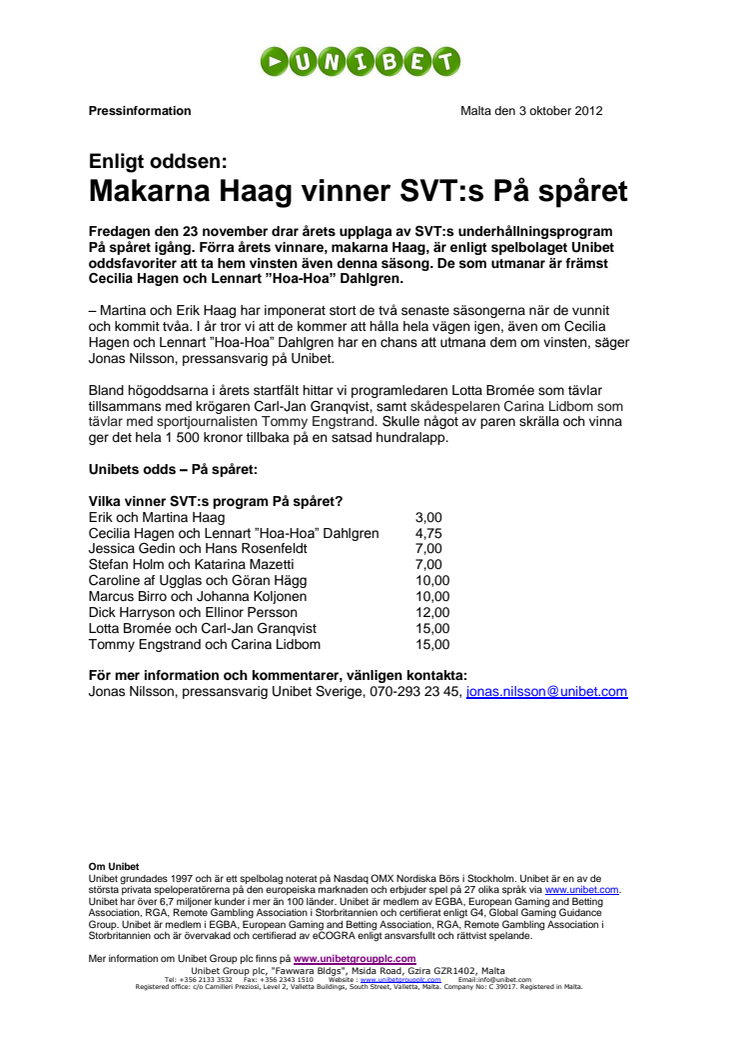 Fredagen den 23 november drar årets upplaga av SVT:s underhållningsprogram På spåret igång. Förra årets vinnare, makarna Haag, är enligt spelbolaget Unibet oddsfavoriter att ta hem vinsten även denna säsong. De som utmanar är främst Cecilia Hagen och Lennart ”Hoa-Hoa” Dahlgren.
