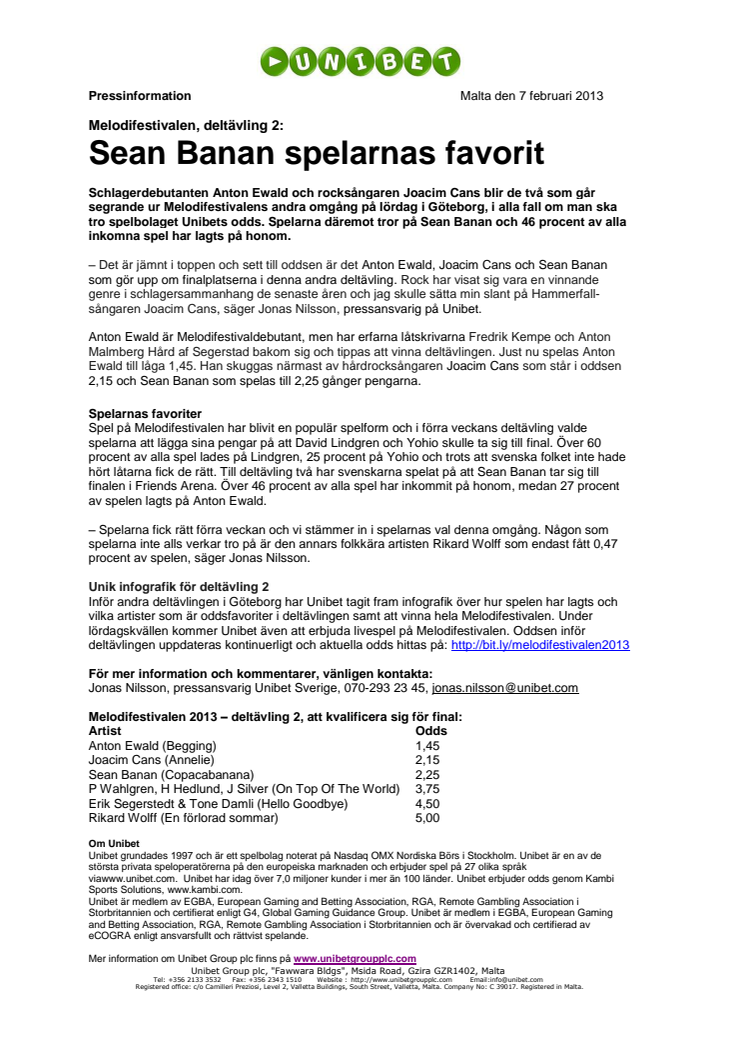 Schlagerdebutanten Anton Ewald och rocksångaren Joacim Cans blir de två som går segrande ur Melodifestivalens andra omgång på lördag i Göteborg, i alla fall om man ska tro spelbolaget Unibets odds. Spelarna däremot tror på Sean Banan och 46 procent av alla inkomna spel har lagts på honom.