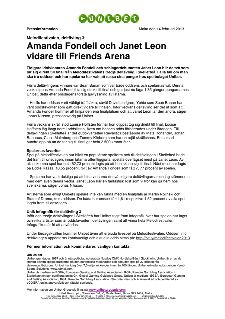 Tidigare idolvinnaren Amanda Fondell och schlagerdebutanten Janet Leon blir de två som tar sig direkt till final från Melodifestivalens tredje deltävling i Skellefteå. I alla fall om man ska tro oddsen och hur spelarna har valt att satsa sina pengar hos spelbolaget Unibet.