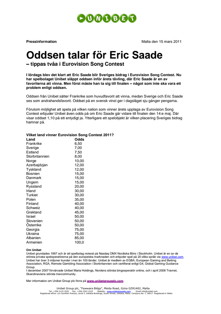 I lördags blev det klart att Eric Saade blir Sveriges bidrag i Eurovision Song Contest. Nu har spelbolaget Unibet släppt oddsen inför årets tävling, där Eric Saade är en av favoriterna att vinna. Men först måste han ta sig till finalen – något som inte ska vara ett problem enligt oddsen.