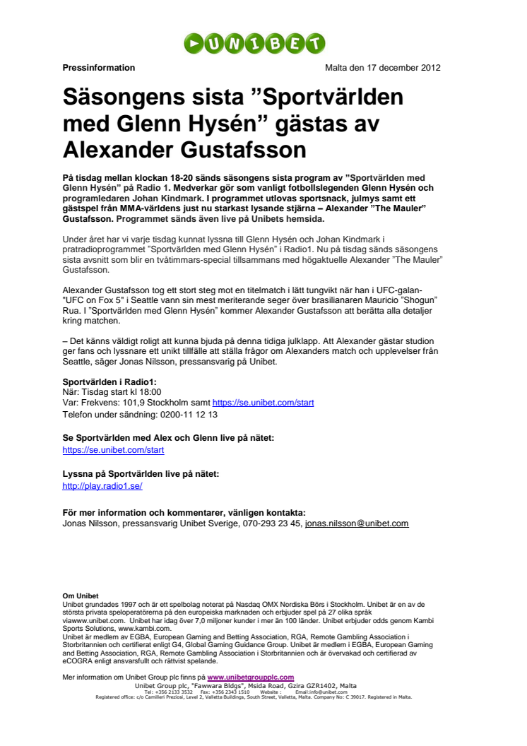 På tisdag mellan klockan 18-20 sänds säsongens sista program av ”Sportvärlden med Glenn Hysén” på Radio 1. Medverkar gör som vanligt fotbollslegenden Glenn Hysén och programledaren Johan Kindmark. I programmet utlovas sportsnack, julmys samt ett gästspel från MMA-världens just nu starkast lysande stjärna – Alexander ”The Mauler” Gustafsson. Programmet sänds även live på Unibets hemsida.