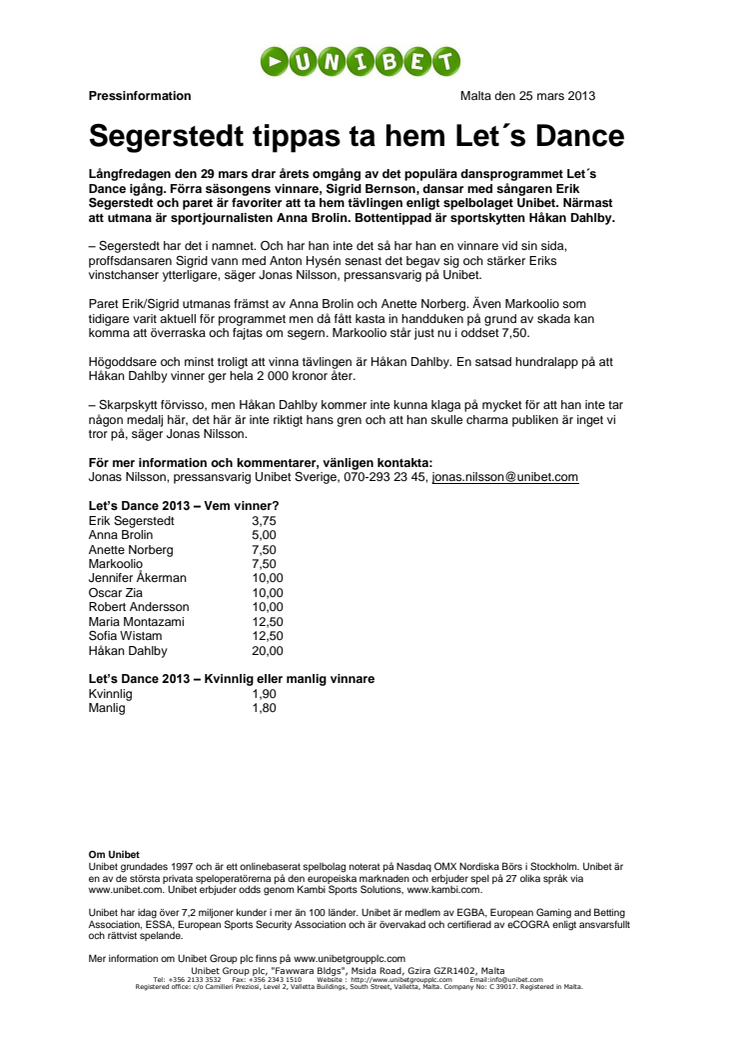 Långfredagen den 29 mars drar årets omgång av det populära dansprogrammet Let´s Dance igång. Förra säsongens vinnare, Sigrid Bernson, dansar med sångaren Erik Segerstedt och paret är favoriter att ta hem tävlingen enligt spelbolaget Unibet. Närmast att utmana är sportjournalisten Anna Brolin. Bottentippad är sportskytten Håkan Dahlby.
