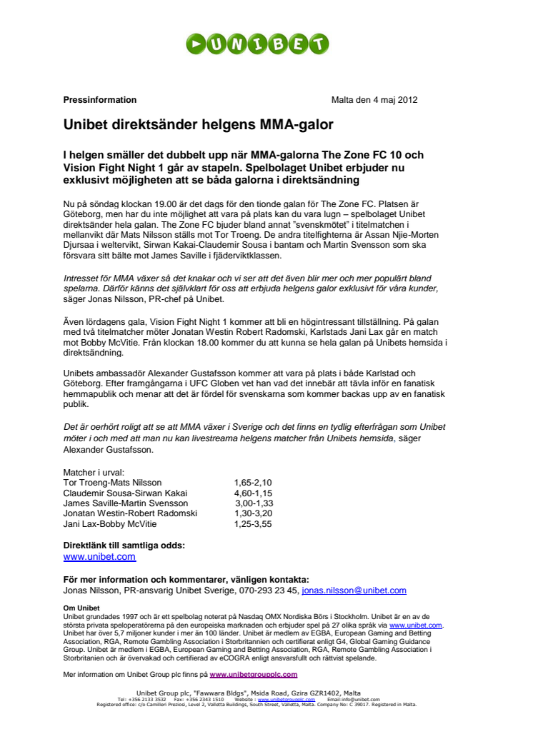 I helgen smäller det dubbelt upp när MMA-galorna The Zone FC 10 och Vision Fight Night 1 går av stapeln. Spelbolaget Unibet erbjuder nu exklusivt möjligheten att se båda galorna i direktsändning.