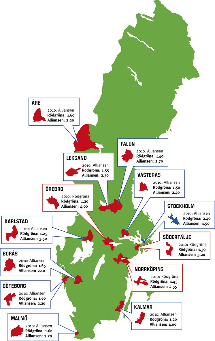 I många av Sveriges största kommuner pendlar resultatet mellan blocken betänkligt i riksdagsval efter riksdagsval. Spelbolaget Unibet har nu tagit fram odds som skvallrar om hur riksdagsrösterna kommer att fördelas i några av Sveriges kommuner. Just nu pekar oddsen på att oppositionen får majoriteten av riksdagsrösterna i tolv av tretton utvalda swing-städer.