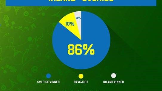 Sverige har både oddsen och spelarna på sin sida inför mötet mot Irland. 86 procent av alla som har spelat på matchen hos Unibet tror att Sverige vinner. Bland svenskarna är siffran ännu högre - hela 92 procent av de svenska spelarna har satsat på svensk seger på Stade de France.