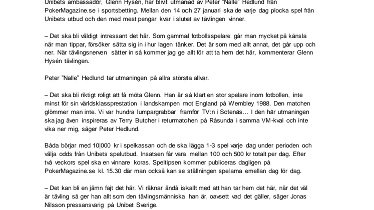 Unibets ambassadör, Glenn Hysén, har blivit utmanad av Peter ”Nalle” Hedlund från PokerMagazine.se i sportsbetting. Mellan den 14 och 27 januari ska de varje dag plocka spel från Unibets utbud och den med mest pengar kvar i slutet av tävlingen vinner.