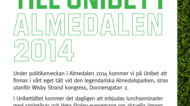 Under politikerveckan i Almedalen 2014 kommer vi på Unibet att finnas i vårt eget tält vid den legendariska Almedalsparken, strax utanför Wisby Strand kongress, Donnersgatan 2.