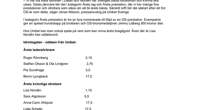 – Vi har två klara favoriter i Zlatan och Nordén när Sveriges bästa idrottsman och kvinna ska utses. Desto jämnare blir det i kategorin Årets lag och Årets prestation, där vi har många fina prestationer och idrottare som slåss om att bli årets bästa. Särskilt tufft blir det såklart efter ett fint OS-år som detta, säger Jonas Nilsson, pressansvarig på Unibet Sverige.