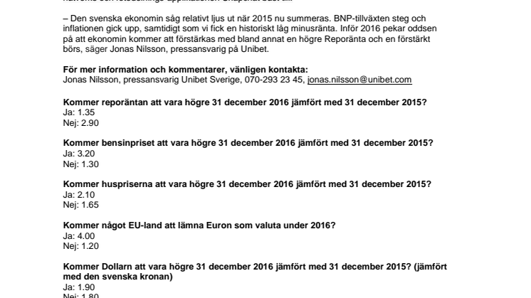 – Den svenska ekonomin såg relativt ljus ut när 2015 nu summeras. BNP-tillväxten steg och inflationen gick upp, samtidigt som vi fick en historiskt låg minusränta. Inför 2016 pekar oddsen på att ekonomin kommer att förstärkas med bland annat en högre Reporänta och en förstärkt börs, säger Jonas Nilsson, pressansvarig på Unibet.