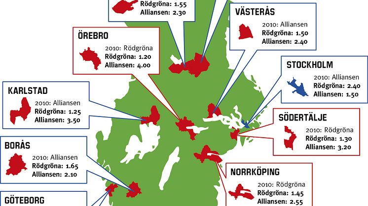 Borås, Kalmar, Karlstad, Malmö, Västerås, Falun, Leksand och Åre är de övriga swing-städer som ser ut att vinnas tillbaka av de rödgröna.