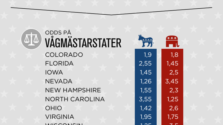 Unibets liveodds kommer att uppdateras under valnatten den 6 november och kommer att spegla det aktuella läget för varje stat och presidentkandidat. Liveoddsen kommer även att kommenteras på Unibets Valodds-twitter @Valodds under hela valnatten.