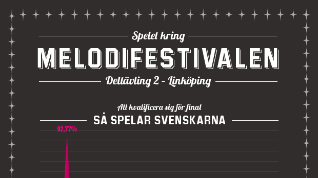 Unibet har även tagit fram infografik över hur spelen har lagts och vilka artister som är oddsfavoriter i den andra deltävlingen samt att vinna hela Melodifestivalen. Under lördagskvällen kommer Unibet även att erbjuda livespel på Melodifestivalen. Oddsen inför deltävlingen uppdateras kontinuerligt och aktuella odds finns på: http://bit.ly/1e6FR2x
