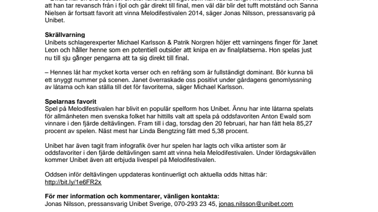 favorit att vinna Melodifestivalen 2014, säger Jonas Nilsson, pressansvarig på Unibet.