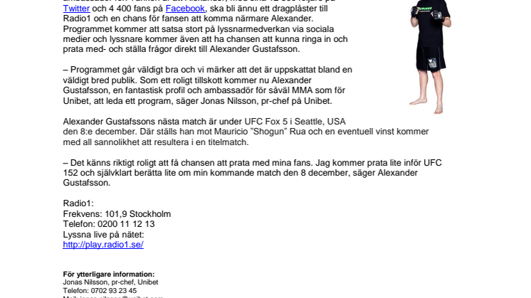 Alexander ”The Mauler” Gustafsson, Sveriges största och mest framgångsrika MMA-utövare genom tiderna tar plats i etern. Den 11 september samt 16 oktober kommer han att gästspela och få ett eget program i pratradiokanalen Radio1. Programmet, som pågår mellan klockan 18-19, kommer framförallt att handla om MMA och UFC.