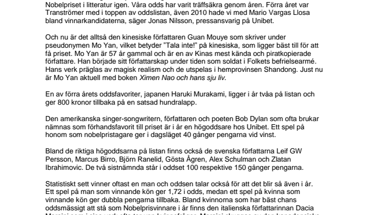 För åttonde året i rad släpper Unibet nu oddsen på vem som ska vinna Nobelpriset i litteratur. Just nu är den kinesiske författaren Mo Yan favorit till oddset 6,5 gånger pengarna. Andra oddsfavoriter är japanen Haruki Murakami, nederländaren Cees Nooteboom samt italienskan Dacia Maraini. De svenska författarna lyser däremot med sin frånvaro på oddslistan. Den som ligger bäst till är Jan Guillou, men skulle han vinna priset ger det hela 2 500 kronor tillbaka på en satsad hundralapp.