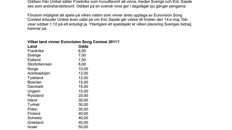 Förutom möjlighet att spela på vilken nation som vinner årets upplaga av Eurovision Song Contest erbjuder Unibet även odds på om Eric Saade går vidare till finalen den 14:e maj. Där visar oddset 1,10 på ett entydigt ja. Ytterligare ett spelobjekt är vilken placering Sveriges bidrag hamnar på.