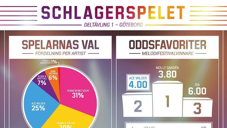 Robin Bengtssons odds har under veckan successivt sänkts och han spelas nu som tredjehandsfavorit att direktkvalificera sig för final till oddset 2.30. Han är också den artist som backas mest av spelarna – 31 procent av alla inkomna spel har lagts på honom följt av Samir & Viktor, 30 procent, och Ace Wilder, 25 procent.