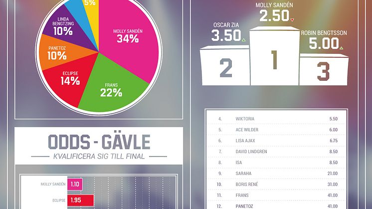 Molly Sandén är fortsatt deltävlingens storfavorit och står just nu i oddset 1.10 att ta sig till finalen. Hon har fått 34 procent av alla inkomna spel. Näst mest tror spelarna på Frans och han har fått 22 procent av alla spel.