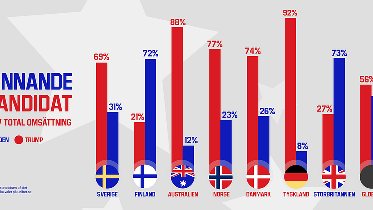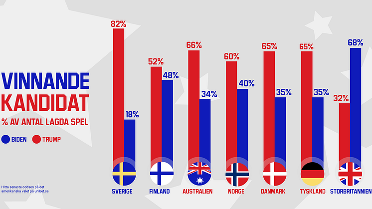 Svenskarnas spelmönster blir extra utmärkande vid jämförelse med andra länder. Bland våra nordiska grannar är det betydligt färre som spelar på Trump. I Finland är 52 procent av spelen på Trump (identiskt med sammanlagda siffror på global nivå) och hela 72 procent av finnarnas insatser är på Joe Biden-seger. Även i Storbritannien, med lång tradition av spel på politik, är det klar fördel Biden, både sett till omsättning och antal spel.
