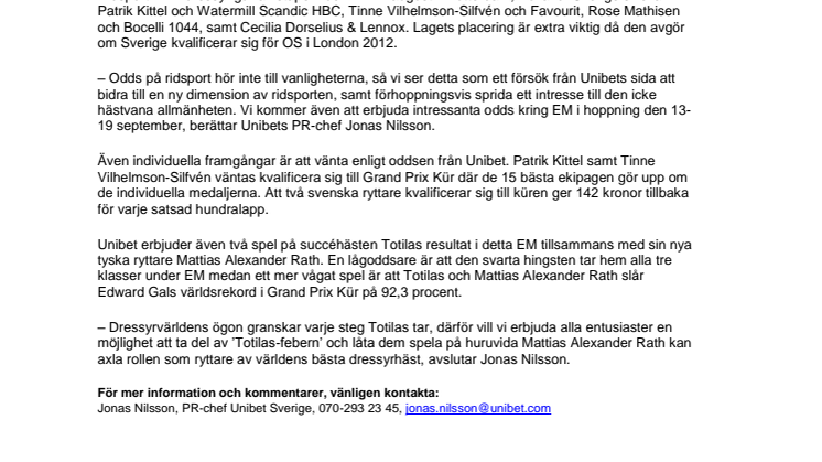 Det ser ut att bli ett framgångsrikt dressyr-EM för Sveriges del. Spelbolaget Unibet erbjuder nu möjligheten att satsa pengar på hur det går för ekipagen i augusti och oddsen pekar på att det svenska laget utan problem kvalar in till OS i London 2012. Dressyrhingsten Totilas prestationer tillsammans med tysken Mattias Alexander Rath är andra intressanta spel att satsa på.