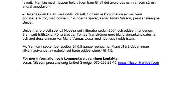 Idag tillkännagavs att den kinesiske författaren Mo Yan tilldelas årets nobelpris i litteratur. Hos svenska spelbolaget Unibet hade spelen rasat in på författaren som sedan en månad tillbaka varit Unibets favorit till priset.