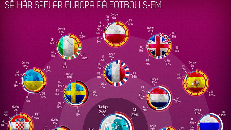 De länder som ingår i spelstatistiken är Frankrike, Sverige, Holland, Norge, Danmark, Finland, Polen, Belgien, England, Spanien, Ryssland, Grekland, Portugal, Tyskland, Tjeckien, Italien, Kroatien, Ukraina och Irland. Alla siffror baseras på de europeiska spelarnas lagda spel på vilka som de tror vinner fotbolls-EM 2012.