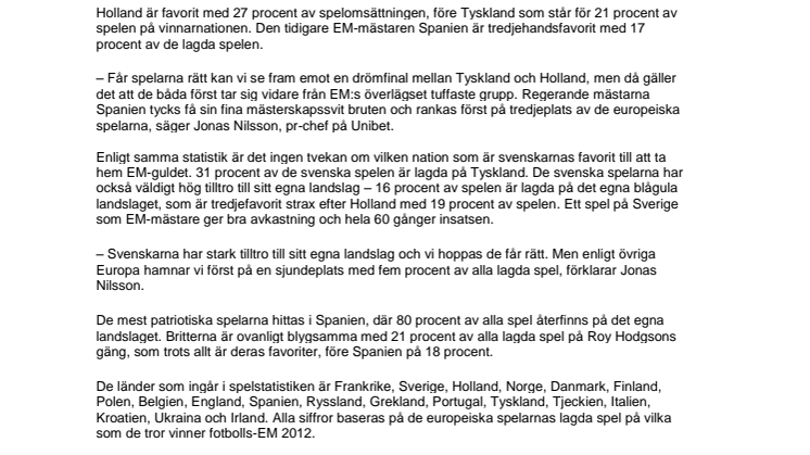 – Får spelarna rätt kan vi se fram emot en drömfinal mellan Tyskland och Holland, men då gäller det att de båda först tar sig vidare från EM:s överlägset tuffaste grupp. Regerande mästarna Spanien tycks få sin fina mästerskapssvit bruten och rankas först på tredjeplats av de europeiska spelarna, säger Jonas Nilsson, pr-chef på Unibet.