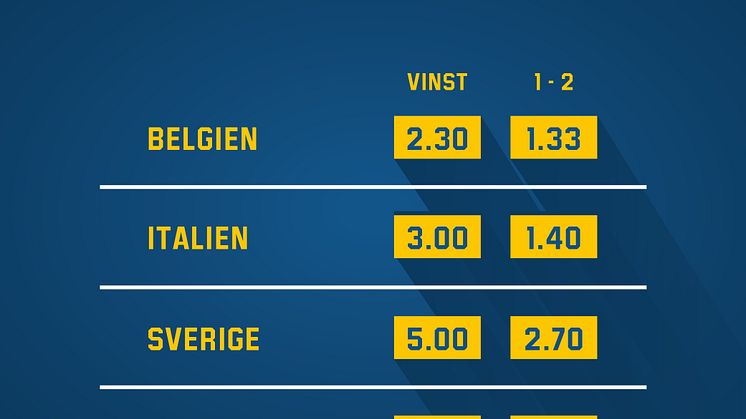 Ikväll blev det klart – Sverige kommer att få möta Belgien, Irland och Italien i gruppspelet under EM i Frankrike 2016. En tuff grupp sett till oddsen från spelbolaget Unibet – Belgien är favorit tillsammans med Italien att gå vidare från gruppen. Sverige att direkt gå vidare från gruppen spelas just nu till oddset 2.70.