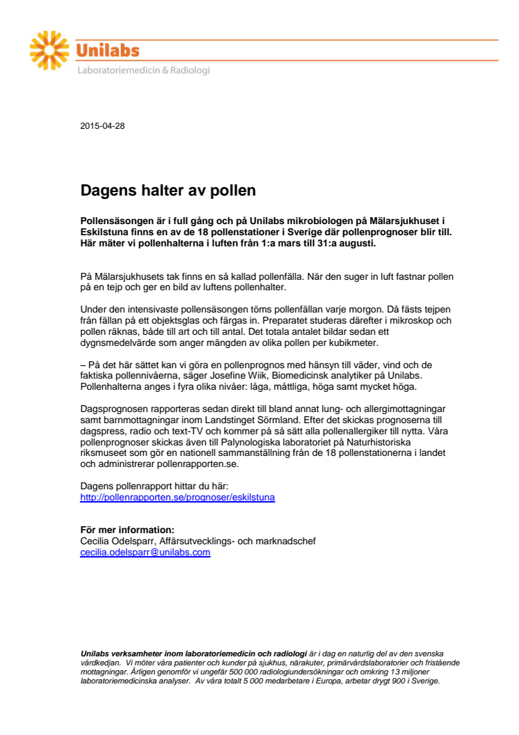 Pollensäsongen är i full gång och på Unilabs mikrobiologen på Mälarsjukhuset i Eskilstuna finns en av de 18 pollenstationer i Sverige där pollenprognoser blir till. Här mäter vi pollenhalterna i luften från 1:a mars till 31:a augusti.