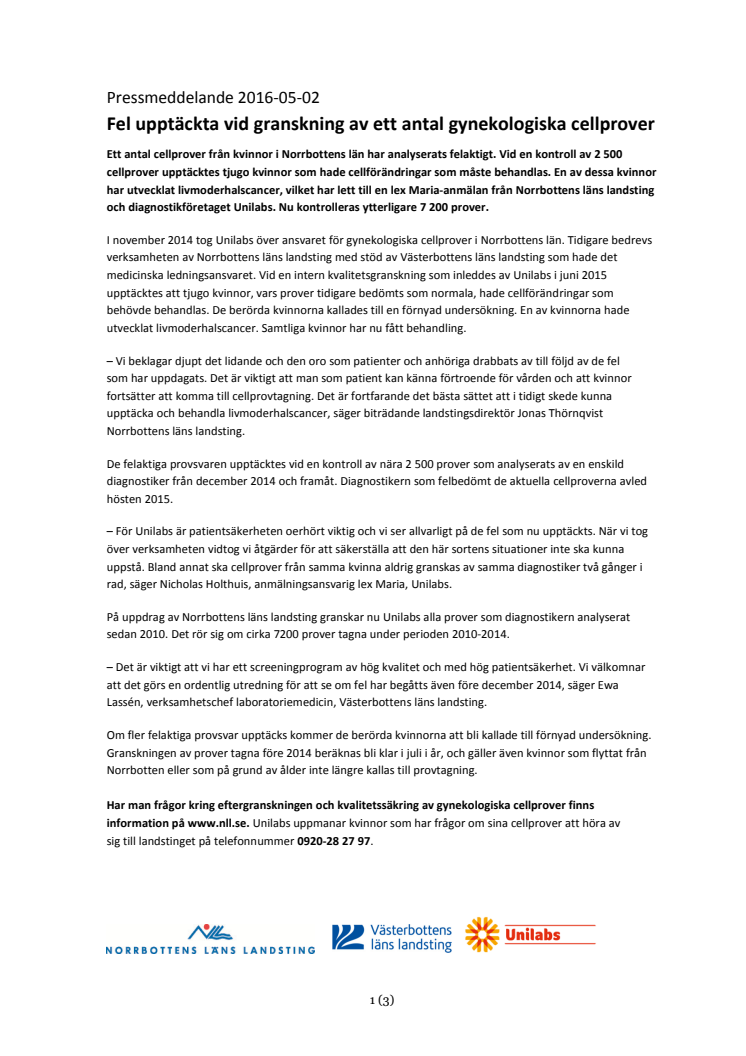 Ett antal cellprover från kvinnor i Norrbottens län har analyserats felaktigt. Vid en kontroll av 2 500 cellprover upptäcktes tjugo kvinnor som hade cellförändringar som måste behandlas. En av dessa kvinnor har utvecklat livmoderhalscancer, vilket har lett till en lex Maria-anmälan från Norrbottens läns landsting och diagnostikföretaget Unilabs. Nu kontrolleras ytterligare 7 200 prover.