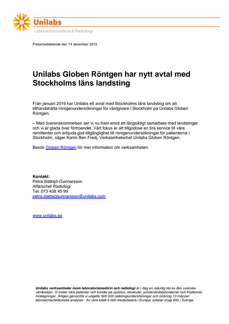 Från januari 2016 har Unilabs ett avtal med Stockholms läns landsting om att tillhandahålla röntgenundersökningar för vårdgivare i Stockholm på Unilabs Globen Röntgen.