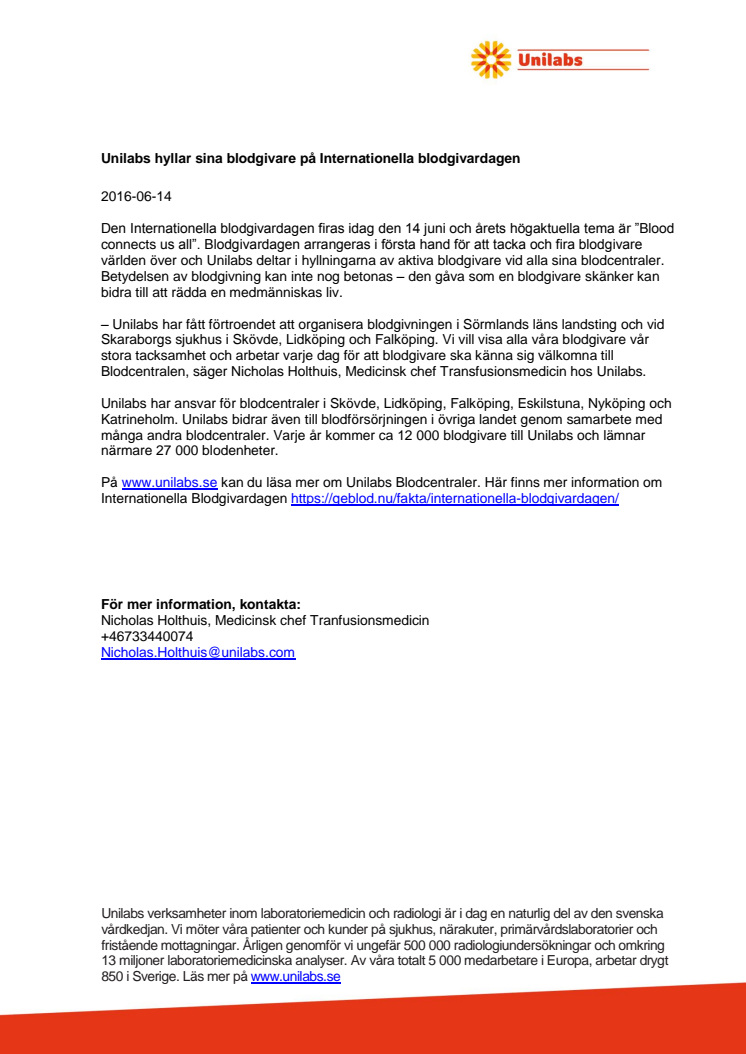 Den Internationella blodgivardagen firas idag den 14 juni och årets högaktuella tema är ”Blood connects us all”. Blodgivardagen arrangeras i första hand för att tacka och fira blodgivare världen över och Unilabs deltar i hyllningarna av aktiva blodgivare vid alla sina blodcentraler. Betydelsen av blodgivning kan inte nog betonas – den gåva som en blodgivare skänker kan bidra till att rädda liv.