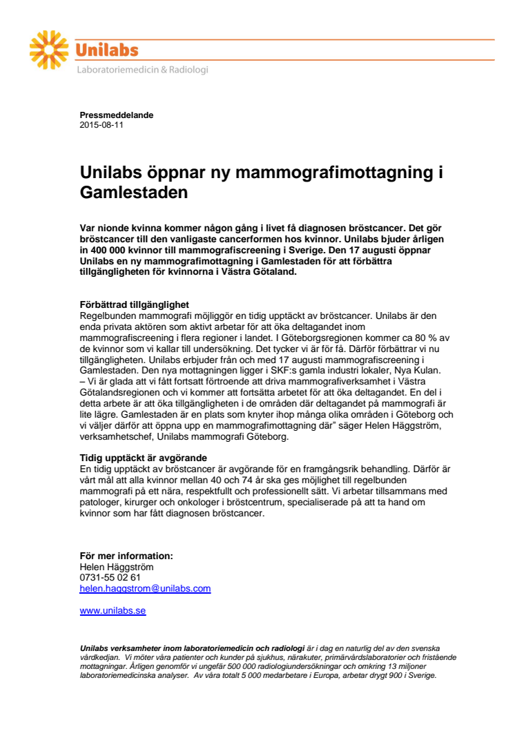 Var nionde kvinna kommer någon gång i livet få diagnosen bröstcancer. Det gör bröstcancer till den vanligaste cancerformen hos kvinnor. Unilabs bjuder årligen in 400 000 kvinnor till mammografiscreening i Sverige. Den 17 augusti öppnar Unilabs en ny mammografimottagning i Gamlestaden för att förbättra tillgängligheten för kvinnorna i Västra Götaland.