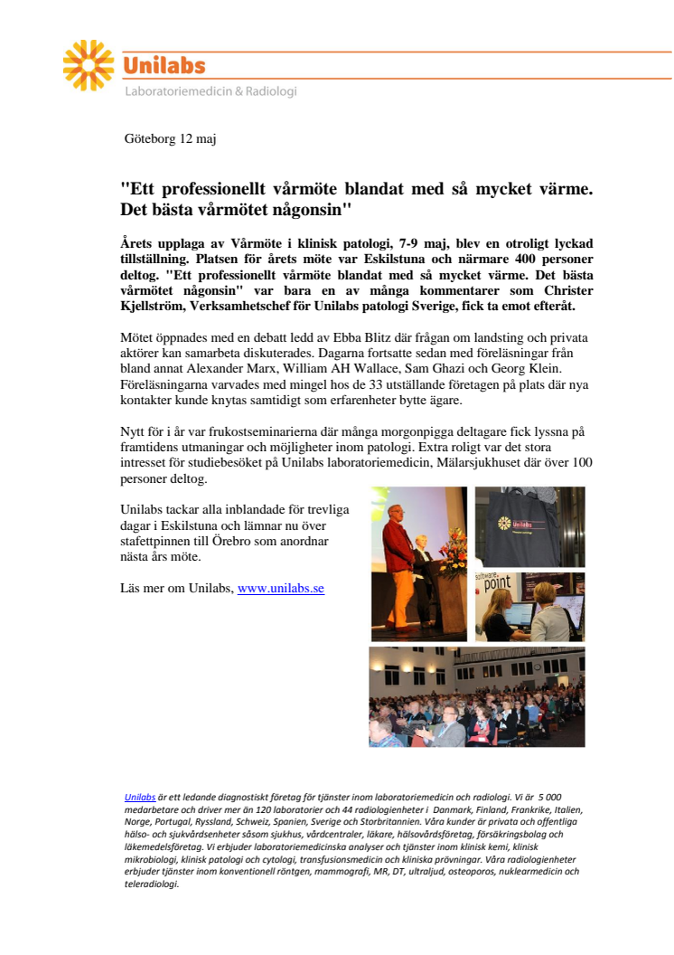 Årets upplaga av Vårmöte i klinisk patologi, 7-9 maj, blev en otroligt lyckad tillställning. Platsen för årets möte var Eskilstuna och närmare 400 personer deltog. "Ett professionellt vårmöte blandat med så mycket värme. Det bästa vårmötet någonsin" var bara en av många kommentarer som Christer Kjellström, Verksamhetschef för Unilabs patologi Sverige, fick ta emot efteråt.