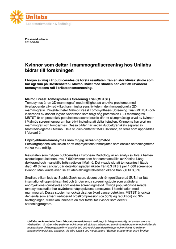 Kvinnor som deltar i mammografiscreening hos Unilabs bidrar till forskningen