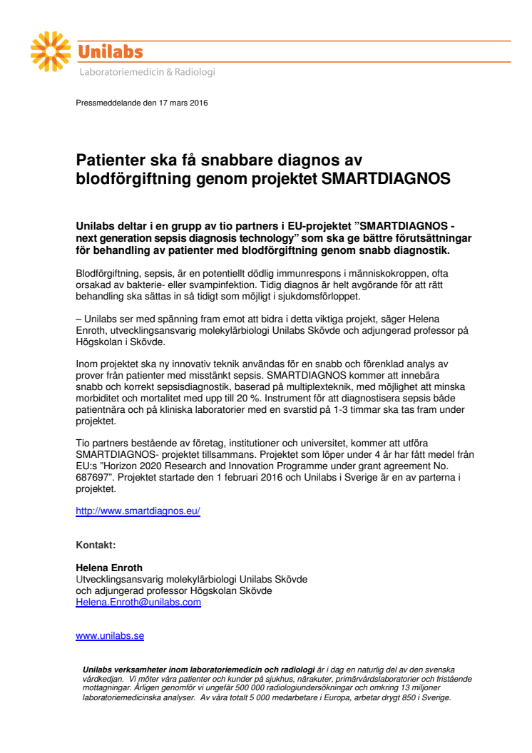 Tio partners bestående av företag, institutioner och universitet, kommer att utföra SMARTDIAGNOS- projektet tillsammans. Projektet som löper under 4 år har fått medel från EU:s ”Horizon 2020 Research and Innovation Programme under grant agreement No. 687697”. Projektet startade den 1 februari 2016 och Unilabs i Sverige är en av parterna i projektet.