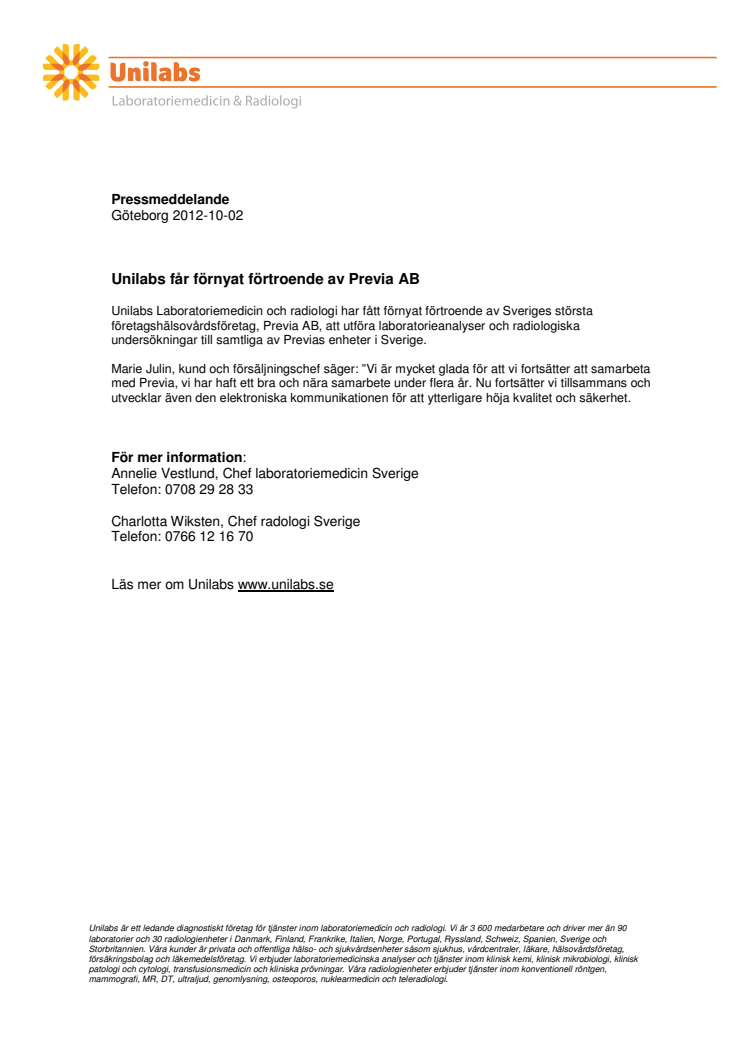 Unilabs Laboratoriemedicin och radiologi har fått förnyat förtroende av Sveriges största företagshälsovårdsföretag, Previa AB, att utföra laboratorieanalyser och radiologiska undersökningar till samtliga av Previas enheter i Sverige.