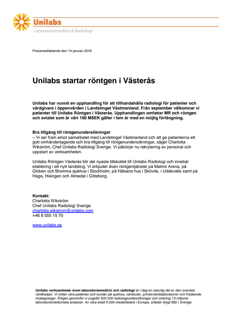 Unilabs har vunnit en upphandling för att tillhandahålla radiologi för patienter och vårdgivare i öppenvården i Landstinget Västmanland. Från september välkomnar vi patienter till Unilabs Röntgen i Västerås. Upphandlingen omfattar MR och röntgen och avtalet som är värt 100 MSEK gäller i fem år med en möjlig förlängning.