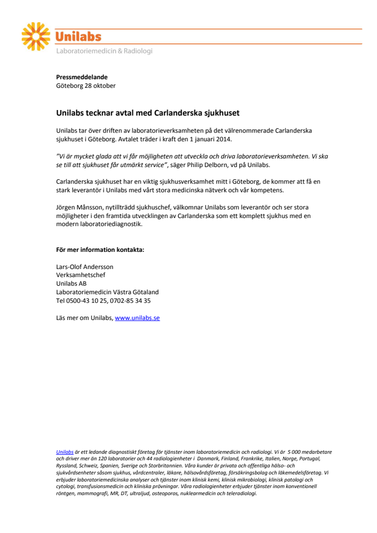 Unilabs tar över driften av laboratorieverksamheten på det välrenommerade Carlanderska sjukhuset i Göteborg. Avtalet träder i kraft den 1 januari 2014.