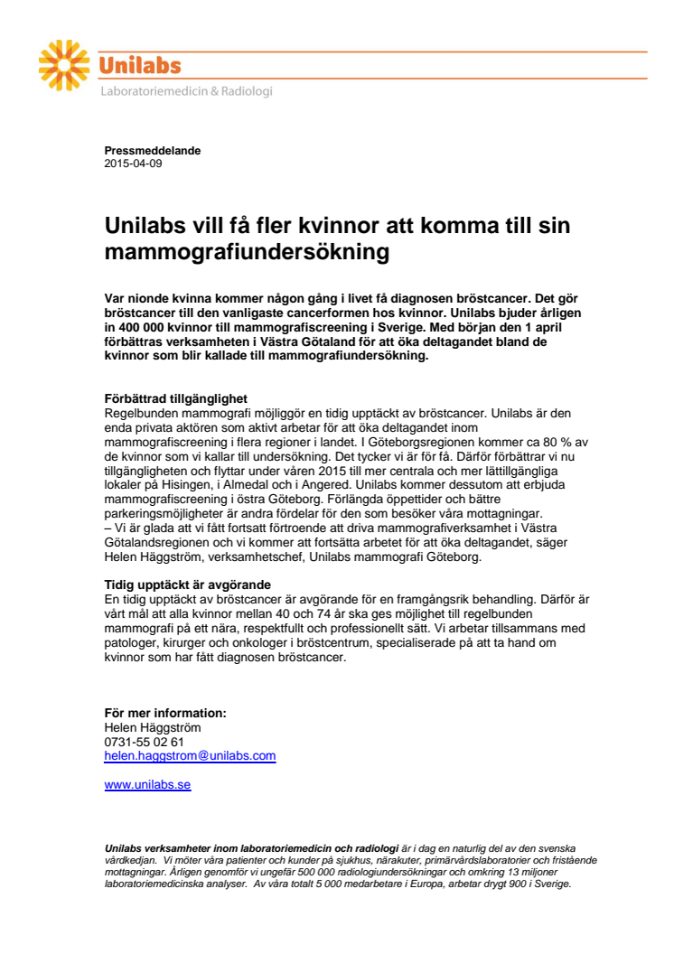 Regelbunden mammografi möjliggör en tidig upptäckt av bröstcancer. Unilabs är den enda privata aktören som aktivt arbetar för att öka deltagandet inom mammografiscreening i flera regioner i landet. I Göteborgsregionen kommer ca 80 % av de kvinnor som vi kallar till undersökning. Det tycker vi är för få. Därför förbättrar vi nu tillgängligheten och flyttar under våren 2015 till mer centrala och mer lättillgängliga lokaler på Hisingen, i Almedal och i Angered. Unilabs kommer dessutom att erbjuda mammografiscreening i östra Göteborg. Förlängda öppettider och bättre parkeringsmöjligheter är andra fördelar för den som besöker våra mottagningar.